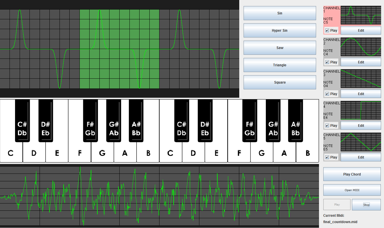 Wavetracer is a program that allows the user to create their own sound waves to learn what qualities different timbres of waves have. They do this by simply drawing the wave they want to hear or selecting one of many preprogrammed waves. This instrument can then be played on the keyboard to see how it sounds musically. The user can also create chords with different instruments and play them together as well as visually see what the resulting wave of their chord looks like. For bonus fun, a MIDI file can be loaded in and it will play the piece with instruments created for each channel.